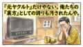 「知らんけど」という巨大な吹き出しがついた2026年プロ野球順位予想を掲げる、黄色と黒のハッピを着た陽気なお父ちゃんの1コマ漫画。画面上部に「忖度100%!?父ちゃんの2026順位予想」という巨大なデカ文字。温かい水彩・色鉛筆風のイラスト。16:9。(※フィクションです、ロゴなし) 父ちゃんの話(タイガース)