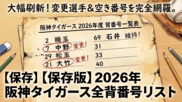 2026年阪神タイガースの最新背番号を一覧で公開!中野「7」、大竹「21」など大幅刷新の意図は?石井大智投手が明かした背番号変更辞退のエピソードや、残り5枠となった支配下登録枠を巡る育成選手たちの熾烈な争いを深掘りします。